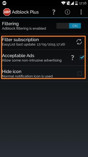 Langkah 2: Buka aplikasi, dan mengaktifkan opsi Filtering. Jika opsi ini tidak diaktifkan, Adblocktidak akan memblokir iklan. Untuk kebanyakan ponsel Adblock otomatis akan set-up proxy dan melakukan yang diperlukan di latar belakang, tanpa memerlukan campur tangan pengguna. Tapi untuk beberapa alasan, jika Anda tidak dapat mengaktifkan Filtering, ikuti panduan ini untukmelakukannya secara manual.